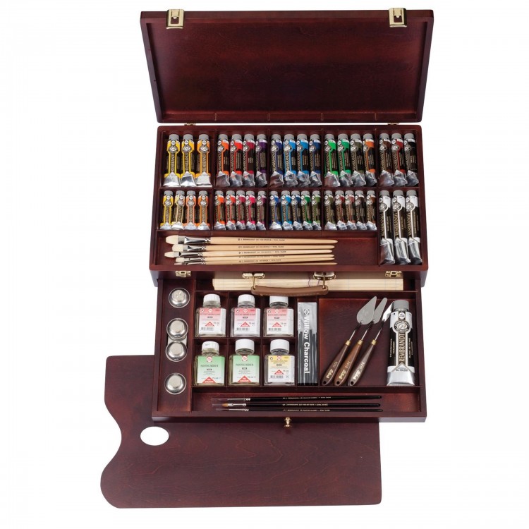 This set also includes 25 charcoal sticks, 3 palette knives, 2 deluxe single palette cups, a double palette cup, a bamboo roll up brush mat, 6 hog bristle brushes (flat sizes 8, 12, 16 and filbert sizes 6, 10, 14), 2 red sable brushes (flat sizes 6, 10), and 2 synthetic fiber brushes (round sizes 4, 8).