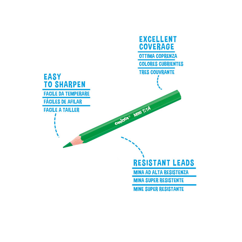 Carioca Pack of 12 mini Titan Coloring Pencils have a tough, ultra-resistant lead making it resistant to breakage if dropped. Provides intense coloring. Hexagonal body with Ø 3 mm lead. Easy to sharpen.