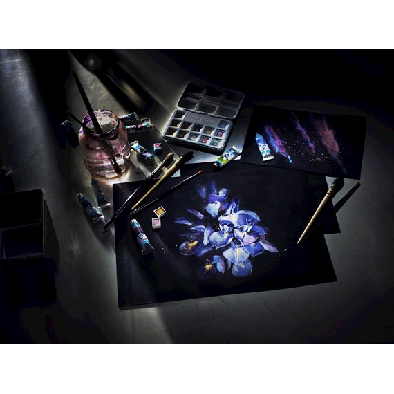 Van Gogh black paper is perfect with interference and metallic water colours. This 140lb. / 360g water colour paper is 100% cellulose and has a cold-press fine grain texture.
