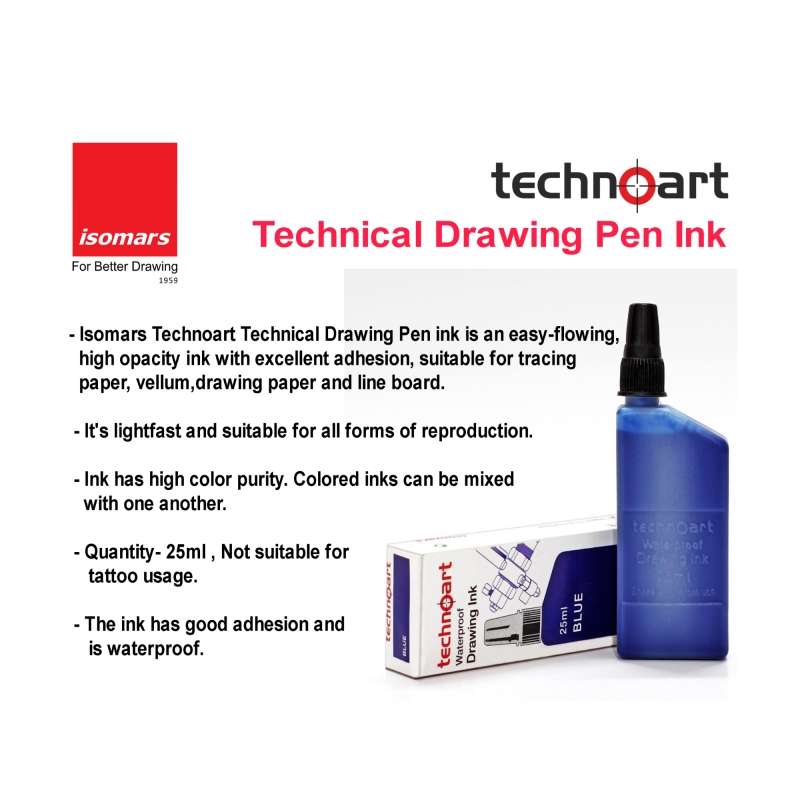 ISOMARS Technoart Technical Drawing Pen ink - Black, Blue, and Red is an easy-flowing, high opacity ink with excellent adhesion, suitable for tracing paper, vellum, drawing paper and line board.