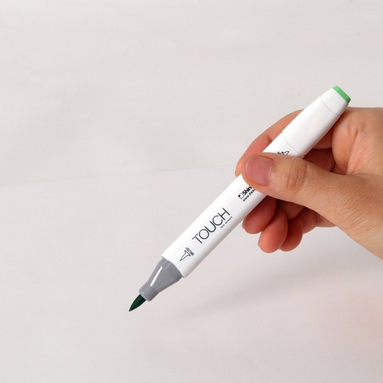 The TOUCH TWIN brush marker features a distinct fine brush nib on one end and a medium-wide chisel nib on the other, allowing users to express a wider range of techniques.