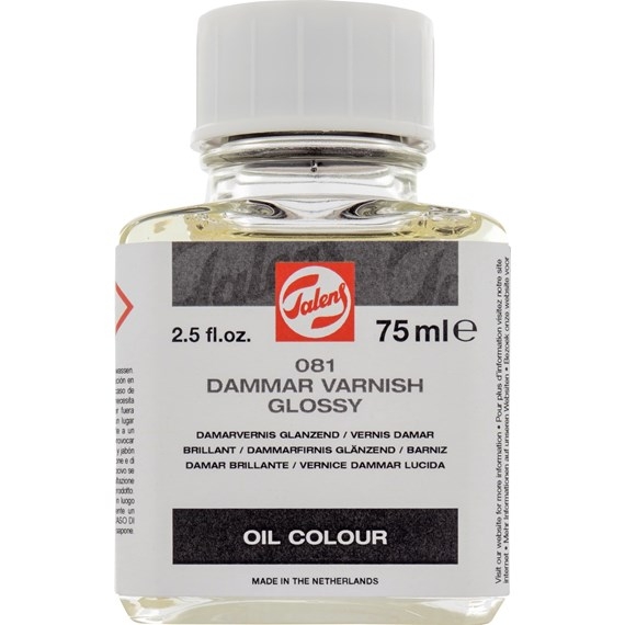 Purpose: Protecting an oil painting. Composition: Dammar resin, turpentine oil • Traditional final varnish • Apply when paint film has completely dried (approx. 1 year with normal layer thickness) • Dries in a few hours • May show signs of ageing after some time such as yellowing and crackling • Gives a high gloss • Mixing with Dammar varnish matt 082 reduces the degree of gloss • Can be thinned with turpentine, clean brushes with white spirit or turpentine • Dry varnish coats can be removed with turpentine • Highly flammable