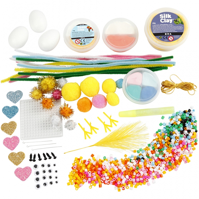 Contents: Silk Clay and Foam Clay in many colours, styrofoam eggs, googly eyes, fuse beads, peg board, chenille, pompoms and glitter