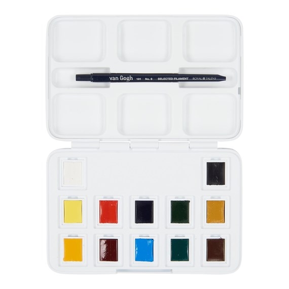 This 12-half pan watercolour set is packed in a pocketbox, includes a round synthetic hair brush (size 6) and a mixing tray.