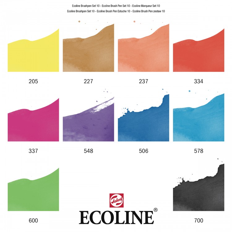 Talens Ecoline Brush Pen Set of 10 is based on dyes and Gum arabic. The colours of Talens Ecoline are astonishingly bright and brilliant. If you wish, you can easily decrease the colour intensity through thinning with water or with the Brush Pen blender (separately available).