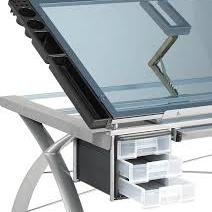 The table top angle adjusts up to 35 degrees. Features include a large pencil drawer, 4 removable side trays for supplies and 3 slide-out drawers for additional storage (mounts on either side of the table).