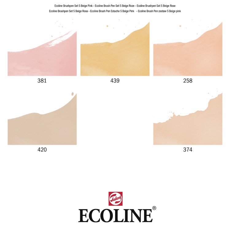 Talens Ecoline Brush Pen Set of 5 - Beige Pink is based on dyes and Gum arabic. The colours of Talens Ecoline are astonishingly bright and brilliant. If you wish, you can easily decrease the colour intensity through thinning with water or with the Brush Pen blender (separately available).