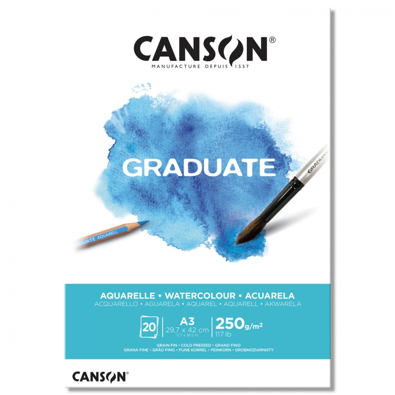 Canson® Graduate Watercolour pads feature white, durable, fine grain paper. They contain 20 sheets of 250gsm paper. Perfect for getting started with watercolours and achieving the best results!