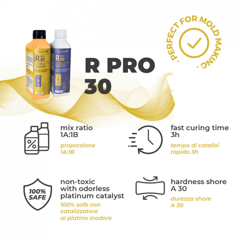 The R PRO 30 is a professional additove silicone rubber that creates molds witha higher hardness level and catalyzes in 3 hours.