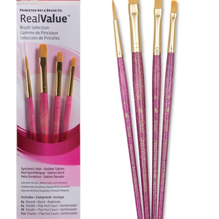 This synthetic Golden Taklon set contains four short handled brushes: Round 4, and Shader 4, 6, and 10. Use them with any media.