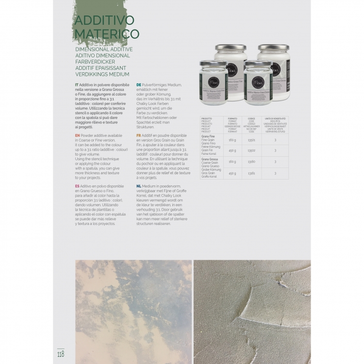 Powder additive available in coarse or fine grain version, to be added to the color in a proportion up to 4: 1 (additive: color) to give volume. Using the stencil technique or applying color with the spatula you can give greater relief and texture to projects.