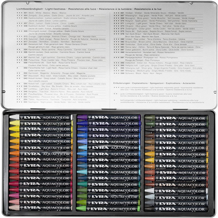 Lyra Aquacolor is a water-soluble wax pastel that responds to the greatest artistic needs thanks to its high concentration of pigments, bright colors and a high resistance to light.
