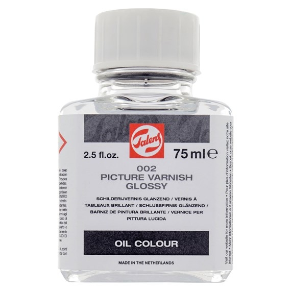 Purpose: Durable protection of an oil painting (final varnish). Composition bottle: Synthetic resin, turpentine oil, white spirit. Composition spray can: Synthetic resin, white spirit • Apply when paint film has completely dried (approx. 1 year with normal layer thickness) • Dries in a few hours • Does not yellow • Gives a high gloss • The gloss can be decreased by mixing with Picture varnish matt 003 • Can be thinned with white spirit or turpentine • Clean brushes with white spirit or turpentine • Dry varnish coats can be removed with white spirit or turpentine • Flammable (in spray can: extremely flammable)