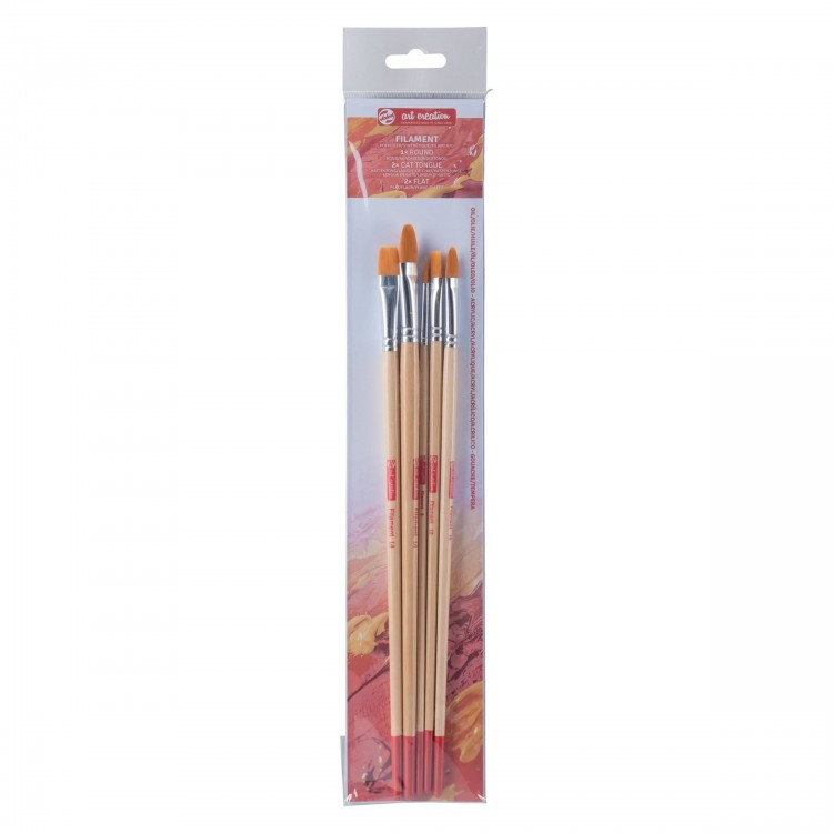 This brush set of polyester is suitable for oil colour, acrylic colour and gouache and contains the following types and sizes: Round brush in size 6, Cat tongue brushes in sizes 10 and 14, Flat brushes in sizes 10 and 14