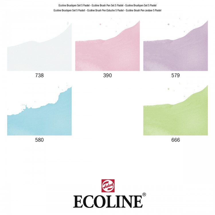 Talens Ecoline Brush Pen Set of 5 - Pastel is based on dyes and Gum arabic. The colours of Talens Ecoline are astonishingly bright and brilliant. If you wish, you can easily decrease the colour intensity through thinning with water or with the Brush Pen blender (separately available).