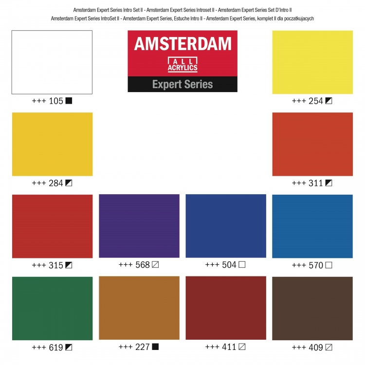 This set contains 12 x 20 ml tubes that are perfect mixing colors for you to start your color palette with. The highly pigmented, Amsterdam Expert Series acrylic colors offer an unrivaled color intensity and lightfastness.