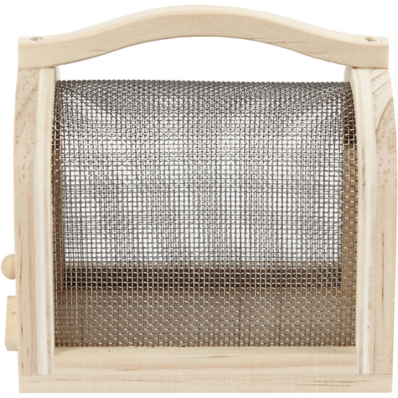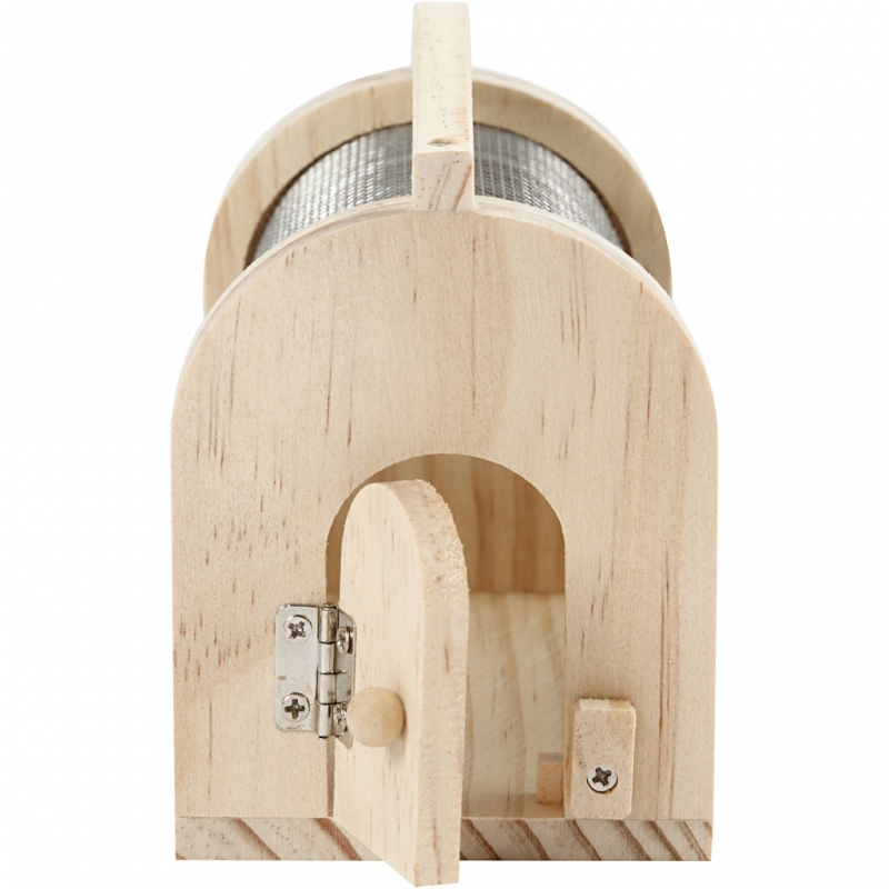 Insect cage in light wood with wire mesh, door at one end and solid handle at the top, so that the cage can be easily transported.