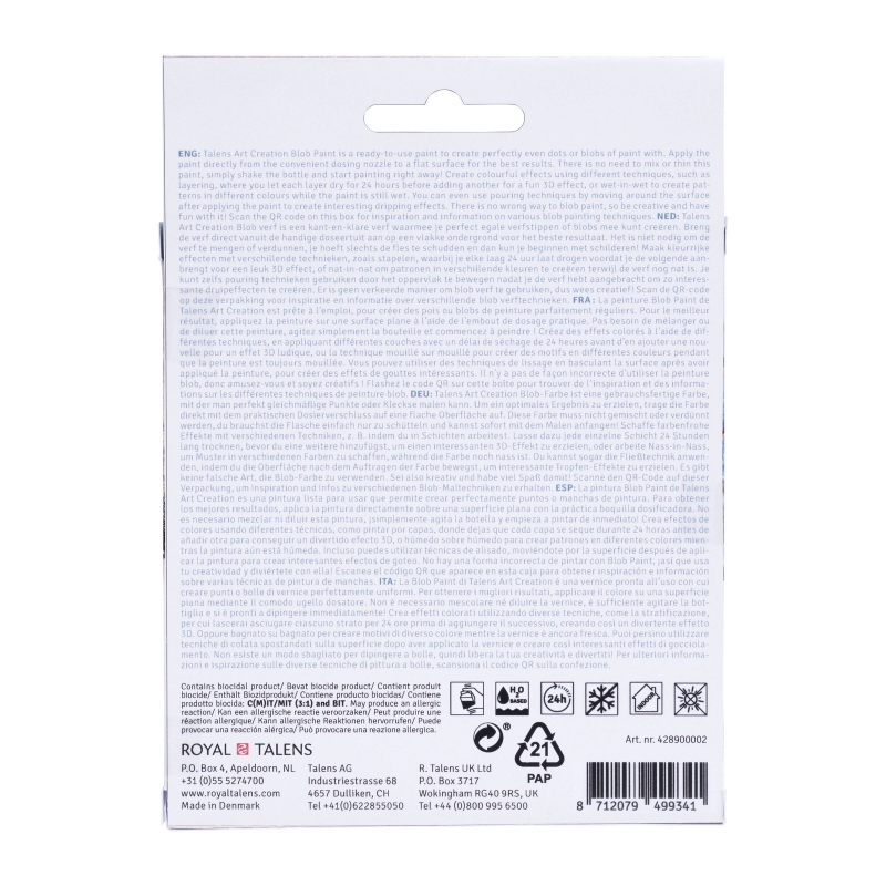 Talens Art Creation Blob Paint is a ready-to-use paint to create perfectly even dots or blobs of paint with. Apply the paint directly from the convenient dosing nozzle to a flat surface for the best results. There is no need to mix or thin this paint, simply shake the bottle and start painting right away!