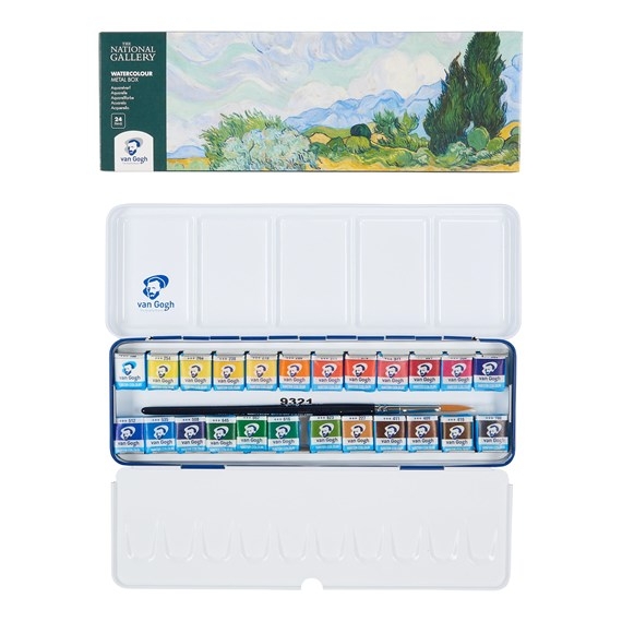 This 24-half pan watercolour set is packed in a metal tin case and includes a round synthetic hair brush (size 3).