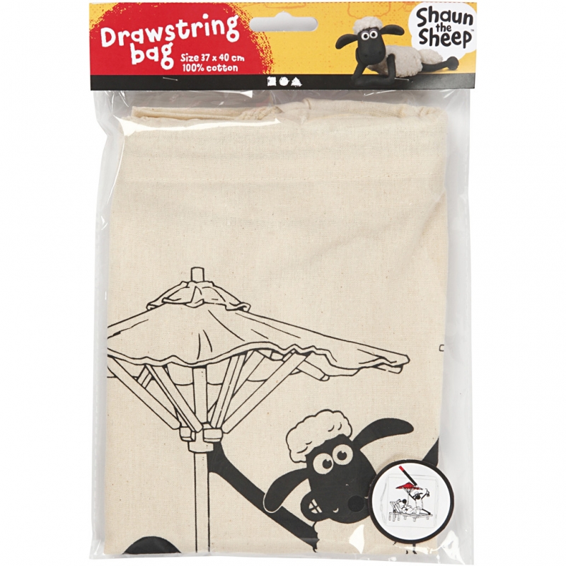 Fun activity for children to design their own Shaun the Sheep bag! Small bag made of 100% cotton with lace closure and preprinted motif by Shaun from Shaun the Sheep. Can be decorated and painted with textile marker.