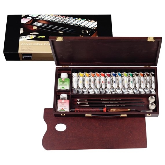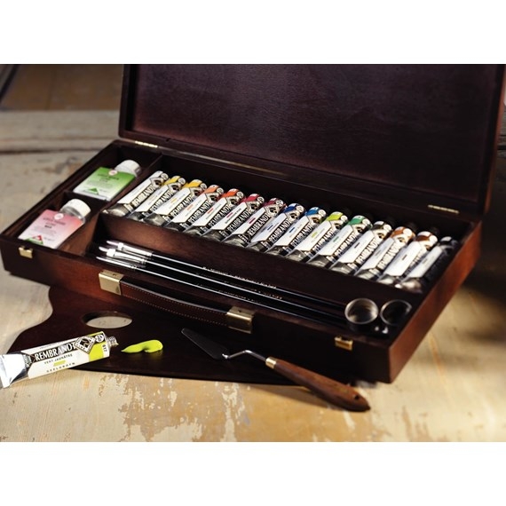 This wooden box Professional includes 15 tubes of 40ml: Titanum White (105), Napels Yellow Red (224), Yellow Ochre (227), Permanent Orange (266), Azo yellow Lemon (267), Azo Yellow Medium (269), Carmine (318), Naphthol Red Medium (396), Burnt Umber (409), Ultramarine (504), Brilliant Blue (564), Emerald Green (615), Yellowish Green (617), Sap Green (623), Oxide Black (735). This box also includes 75 ml Talens Acrylic medium mat, 75 ml Talens Acrylic varnish glossy, 3 brushes: - series 290 no. 12, series 291 no. 6, series 292 no. 8 (polyester fibres, selected filament), a painting knife no. 3012, a double palette cup, a tube with 3 sticks charcoal, a wooden palette and a Colour mixing brochure.