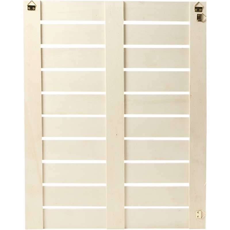 Panel of slats in light wood, mounted with brackets for both vertical and horizontal suspension.