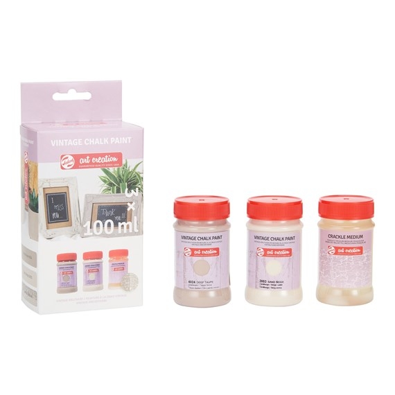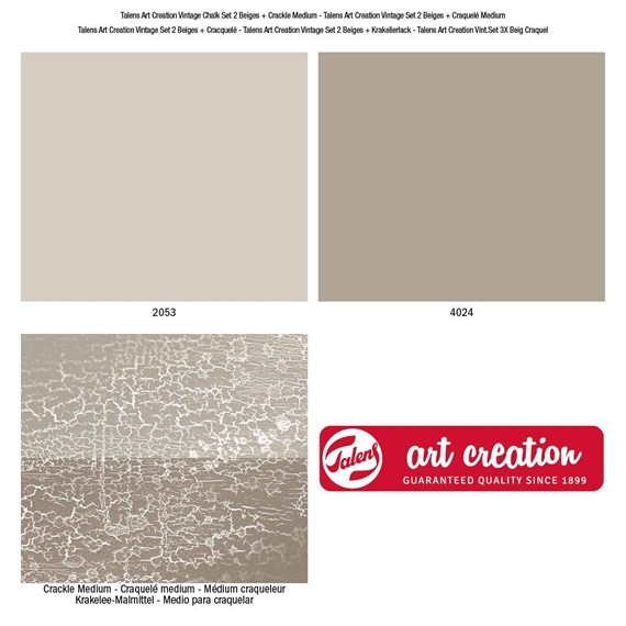 Apply one or two layers, depending on the desired coverage. Use a soft brush or a smooth roller to apply the paint and clean it with warm water. Stir before use. Colours can be mixed. Or you can use Crackle Medium for a craquelé effect (cracks) in the paint layer. Contents: 2 x 100 ml (2053-4024) and 100 ml crackle medium.
