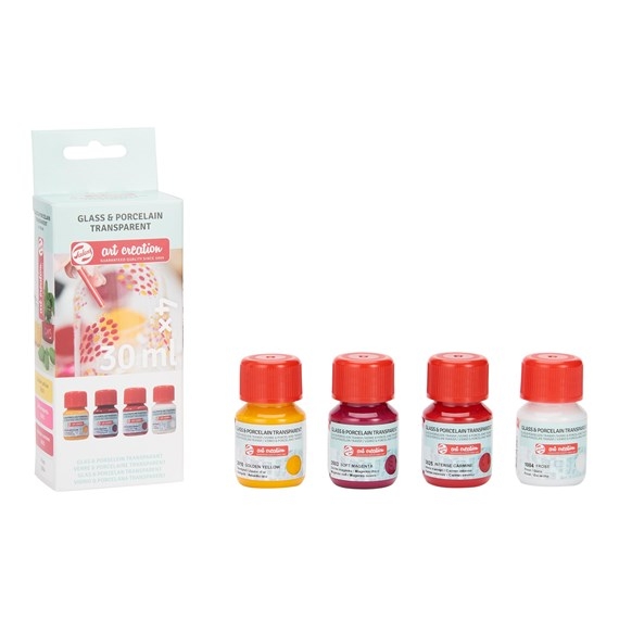 A transparent paint for use on glass, porcelain and ceramics. The transparent character of the paint is particularly visible on glass, but the combination of transparent and opaque can also create some attractive effects. With the transparent paint, you can, for example, create sponge effects.