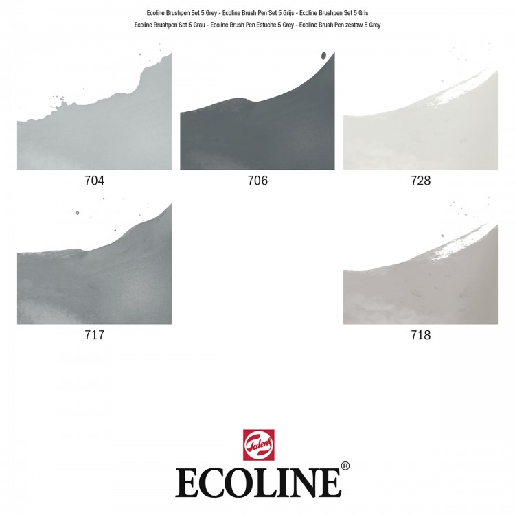Talens Ecoline Brush Pen Set of 5 - Grey is based on dyes and Gum arabic. The colours of Talens Ecoline are astonishingly bright and brilliant. If you wish, you can easily decrease the colour intensity through thinning with water or with the Brush Pen blender (separately available).