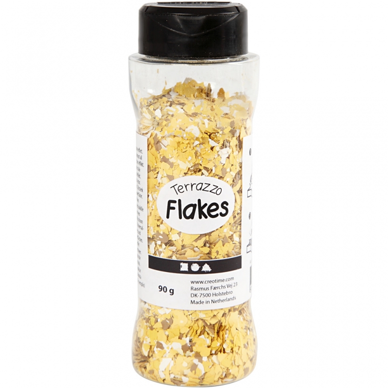 Harmony of paint flakes which with the aid of waterbased glue, laquer or paint forms a terazz-like effect on almost all types of surfaces. Apply a layer of glue, laquer or paint to the desired item. Then dry the flakes in the wet glue and let dry.