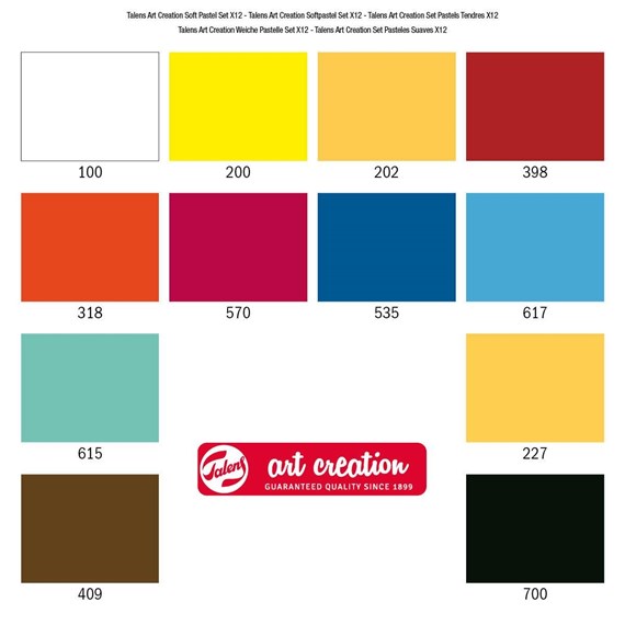 Talens Art Creation soft pastels are a soft dry pastel with which you can draw in a picturesque manner. Soft pastels are made with high quality pigments offering vivid and intense colours, which are easy to apply and blend.