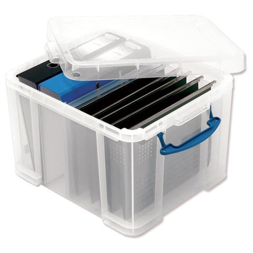 This Really Useful Box is a transparent, solid plastic box for multi-purpose storage. The 35 litre box comes with a lid and clip lock handles to keep its contents secure.