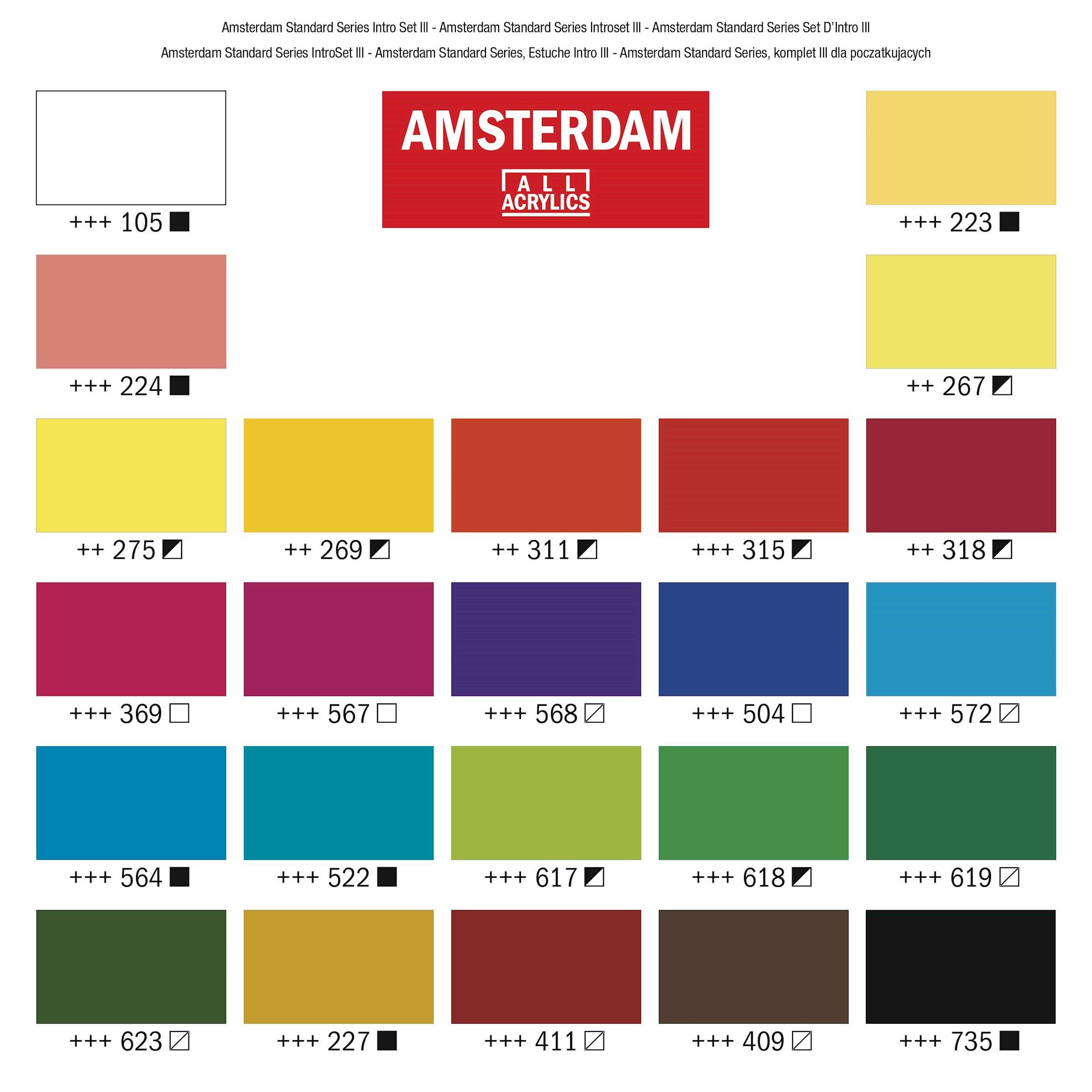 This set provides a balanced color palette and multiple opacities. The 24 x 20 ml tubes of Amsterdam Standard Series Acrylics are made with high-quality pigments and 100% acrylic emulsion - this medium viscosity paint provides nice brush strokes and texture, but can also cover large areas with a smooth color.