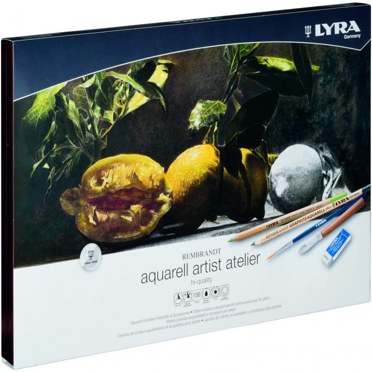 The set consists of: wooden box, 96 pcs. Rembrandt Aquarell colored pencils, 3 pcs. Graphite pencils, black chalk pencil, eraser, sandpaper, sharpener, knife, 2 brushes (5 and 8 no.)