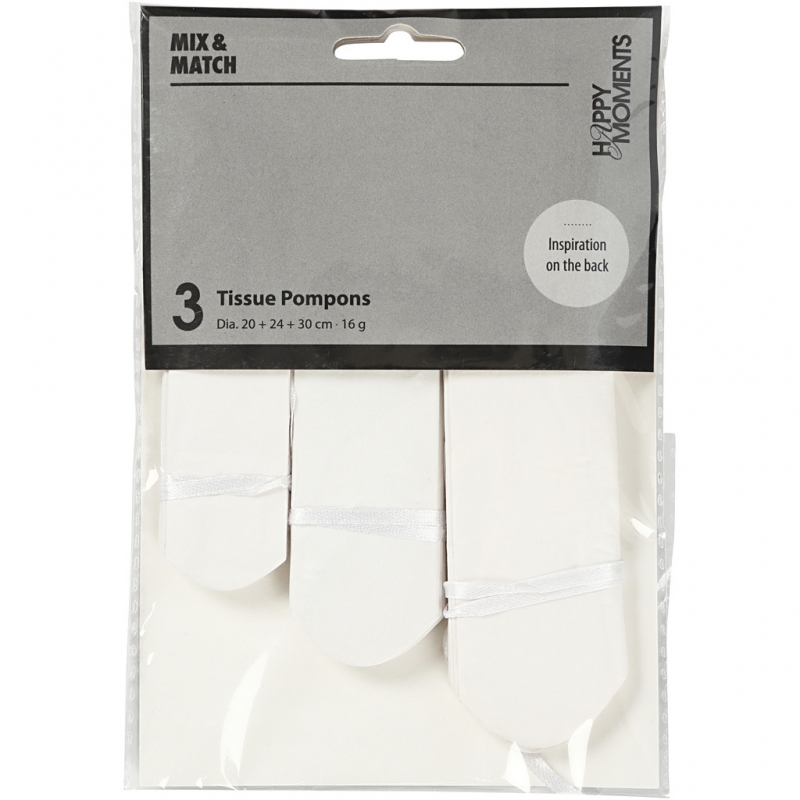 Airy pompoms made of silk paper. They fold out into round balls and are tied with string. Pack includes 3 different sizes. Supplied unassembled.